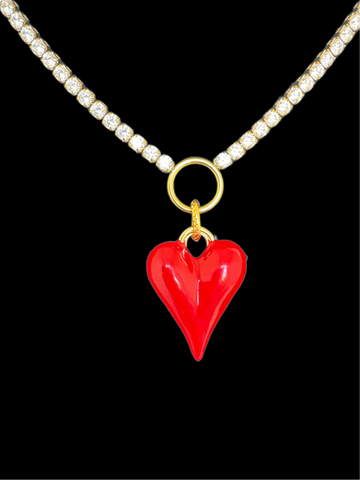 Adorable enamel red double-sided  puffy heart charm paired with a gold rhinestone chain tennis necklace with a swivel ring clasp.