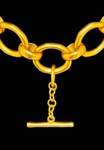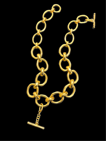 A fantastic statement necklace! Modern and current with a single drop toggle. The chain is elegant and substantial with splendid gold links. Goes with everything! Toggle closure.