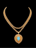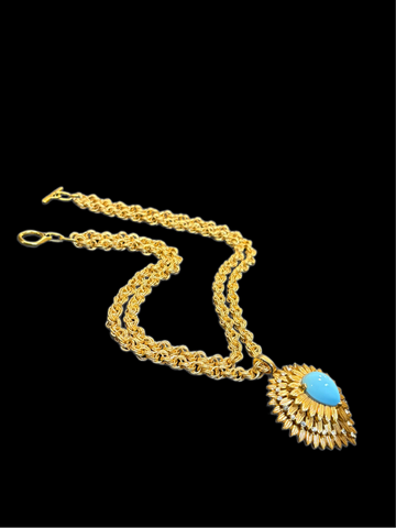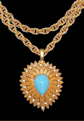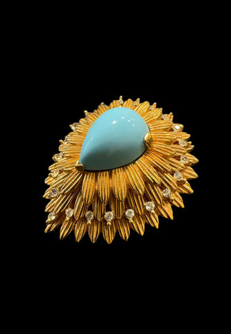 Fabulous domed vintage turquoise JOMAZ brooch intricately designed with three levels of textured leaves and clear crystals. Very SPECIAL!