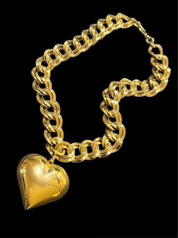 Fabulous vintage extra large puffy heart gold pendant paired with a rare vintage interlocking triple gold chain. A wonderful statement necklace!